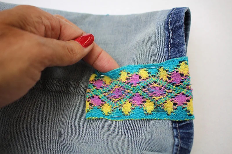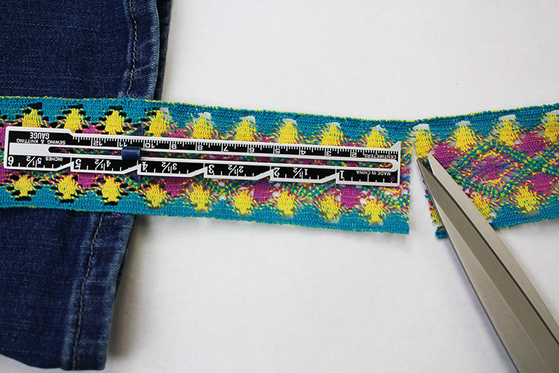 - Pin the ribbon/ trim all the way to the hemline. If you plan on folding up the jeans, measure 4 inches below the hemline and cut the trim. If you are not going to fold up the jean hem, measure 2 inches and cut off any excess ribbon.