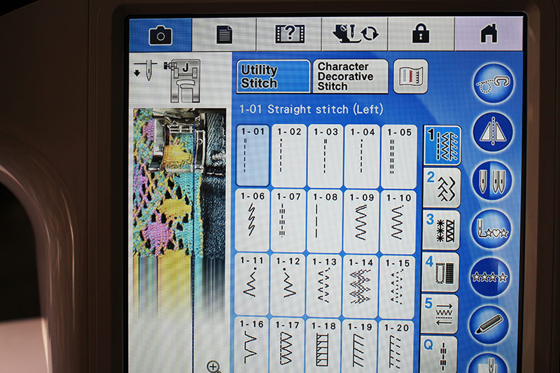 - Click on the #5 ICON for directional sewing. Choose stitch 5-05 which will stitch sideways to the right. Utilize the camera feature in order to the stitch along the edge of the trim.
