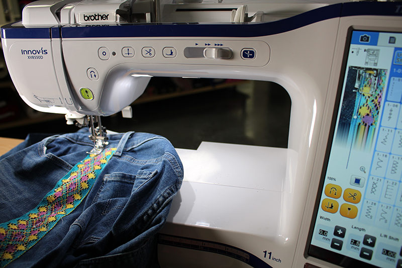 You might have noticed some of the fashions of the late 60’s and 70’s making a comeback on the store shelves, from floral fabrics to embellished jeans. We have focused on embellishing jeans with free motion embroidery