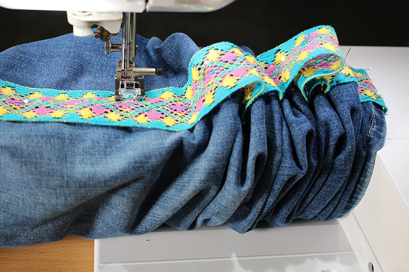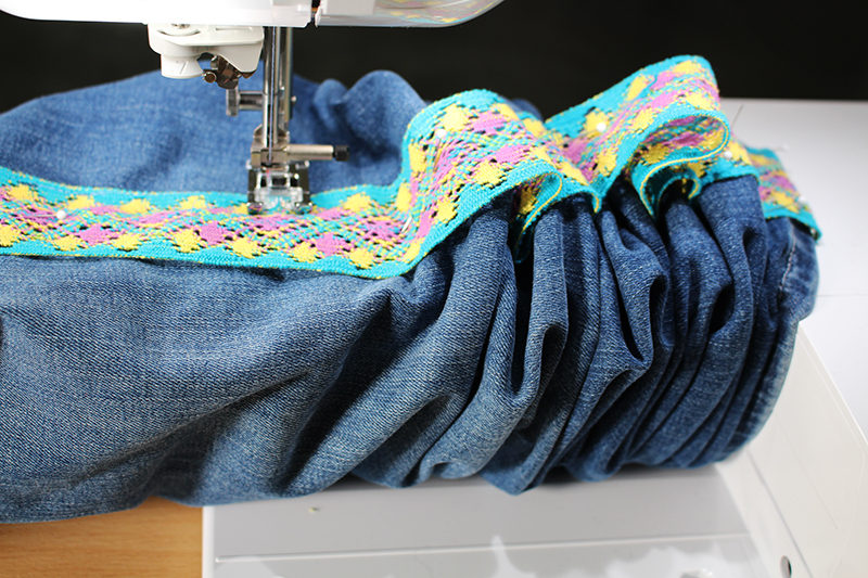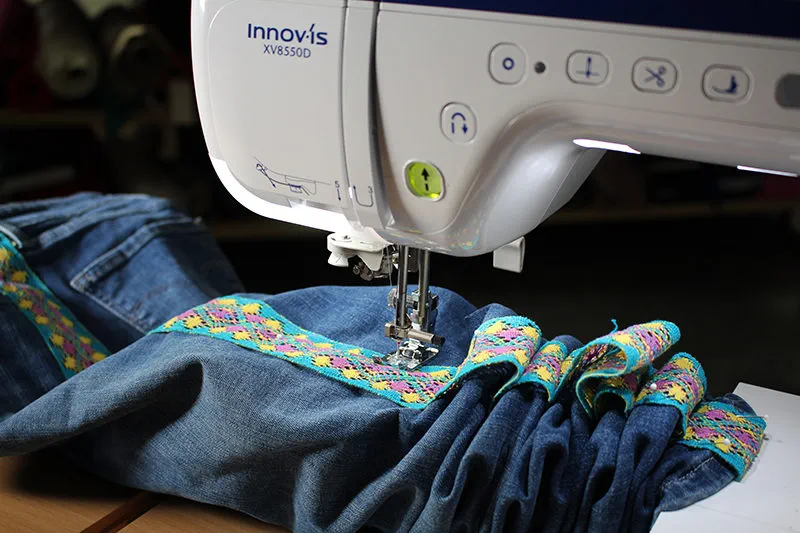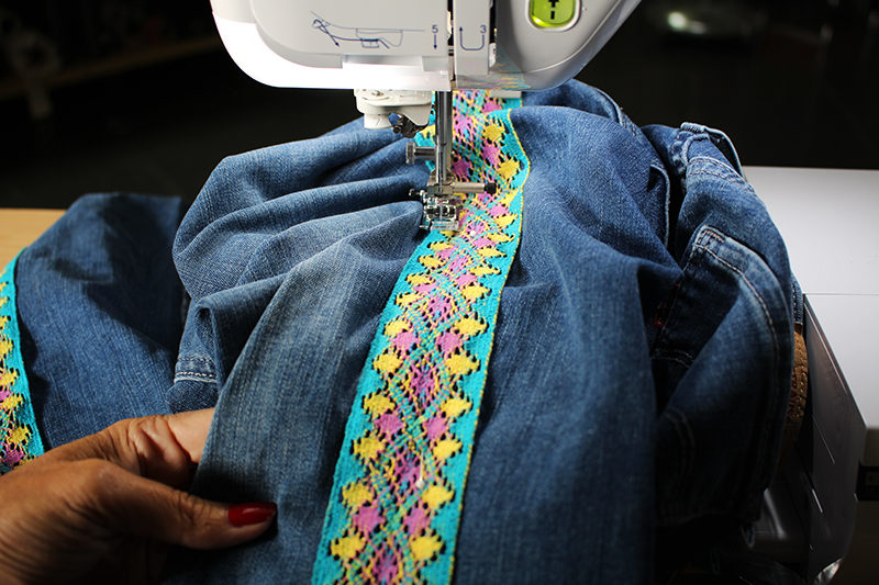 - Once you have stitched as far down as possible, backstitch once, cut the thread, and slide the jeans back up to the top of the trim. Move the needle to the far-left position and stitch down the other side of the trim.