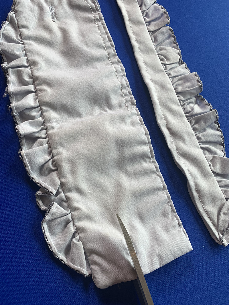 Attaching the ruffle to the shoulder is easy! With the ruffle facing out, pin the finished cuff-ruffle inside the top of the pressed shoulder. Note, the ruffle only covers about ¾ of the shoulder. Sew it in place in the armhole, and top stitch the remaining folded edges of the armhole. Finish the ruffle embellishment on the other armhole.