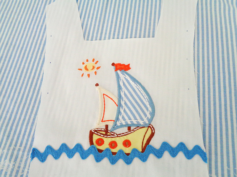 - Designs: Schooner sailboat appliqué design available at appliqueandembroideryoriginals.com, small sun embroidery design from Baby Pooh and Friends Card