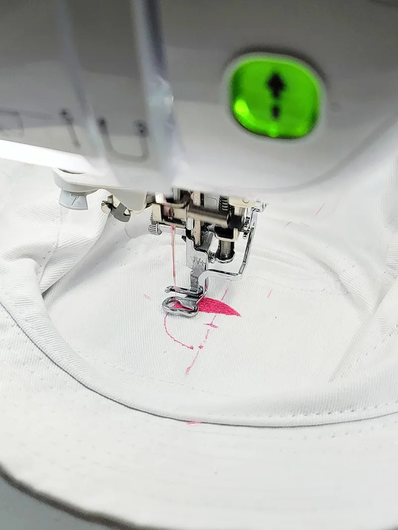 9. Attach the embroidery hoop to the machine, lower the foot, and press the green button. The machine should automatically start sewing.