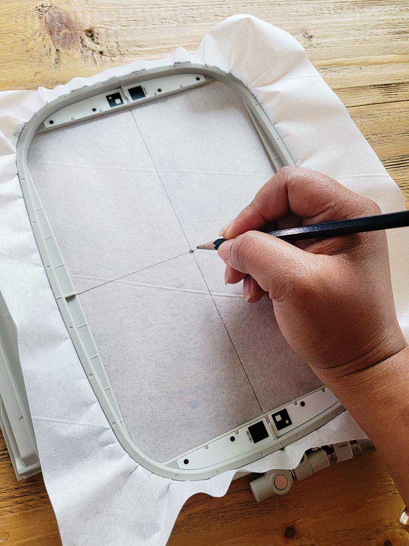 4. Use the markings on the hoop, to draw vertical and horizontal center lines on the stabilizer to mark the center of the embroidery area.