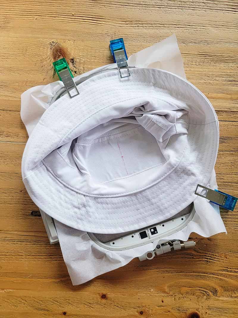 7. Adhere the hat to the center of your stabilizer, making sure that the marked lines and centers align perfectly. Smooth out the fabric to ensure that no folds are in the way of the embroidery. Pull the excess fabric out of the way and hold it in place with masking tape and fabric clamps. Set aside.