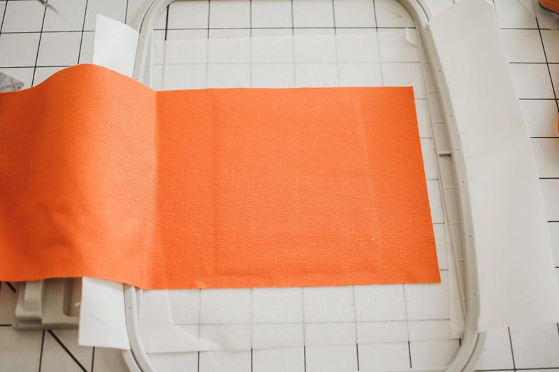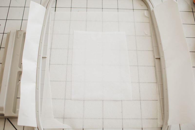 3. My fabric had a bit of stretch in it, so I used 1 layer of sticky stabilizer and 1 layer of a medium tear or cut away stabilizer. I layered as you can see here before adding my fabric on top. You can also hoop your fabric and then cut the rectangle later.