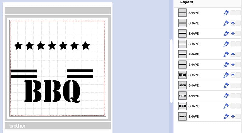 At this point you have a wonderful apron to wear and use, but you can make it even better with a fun free vinyl design. Download the free svg design {link above} and grab some vinyl. Download the free .zip file. Unzip to access all the file types. You can import the svg file directly into Canvas Workspace. It should look like this. You can view different parts of the file, or hide them by toggling the eye in each layer.