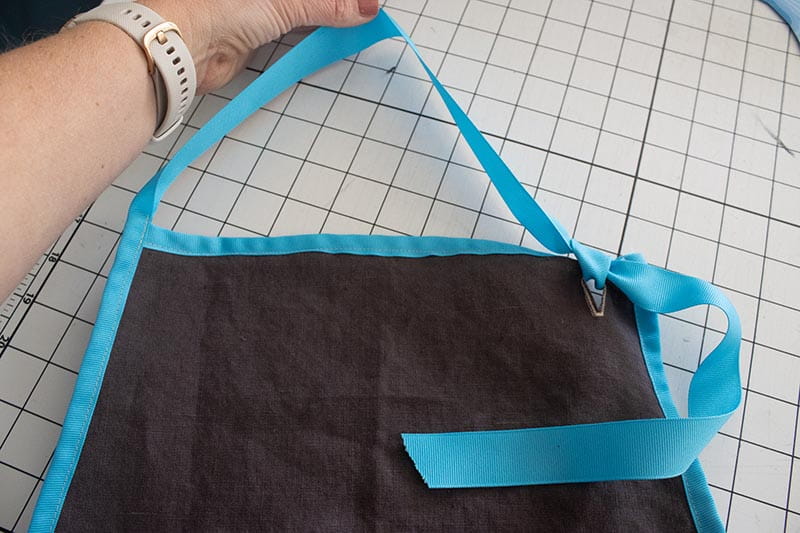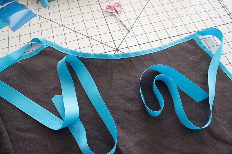 Next back to finishing the edges of the apron. Use ribbon to finish the top, short edge of the apron.