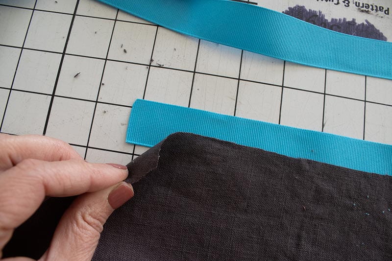 Now it’s time to begin finishing all the raw edges. Start by adding ribbon or bias tape to the longest edge. The bottom curved one. Fold the ribbon in half and sandwich the fabric in the center. If you are using bias tape, it will already have a fold to place around the fabric. Pin or clip in place.