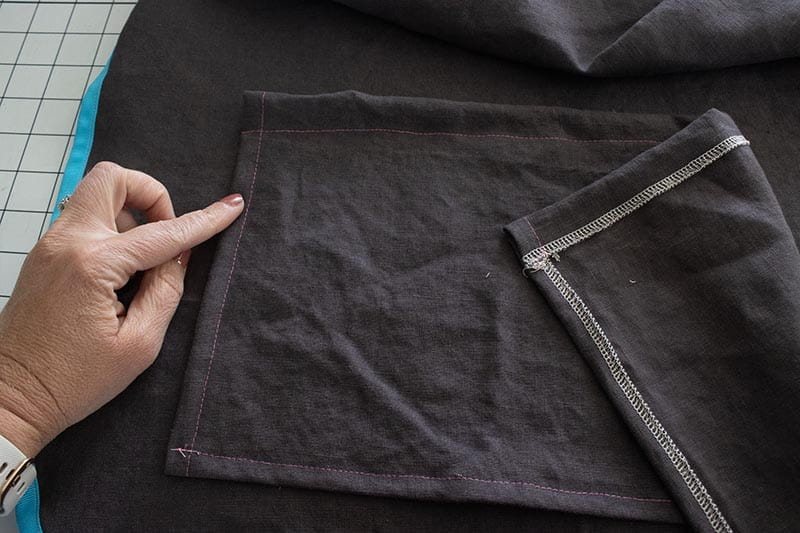 Fold back ½” on all sides of the pocket and stitch back to finish the pocket edges. Once you have the pocket edges finished, pin to the apron. You may want to hold the apron up to your front to check out pocket placement.
