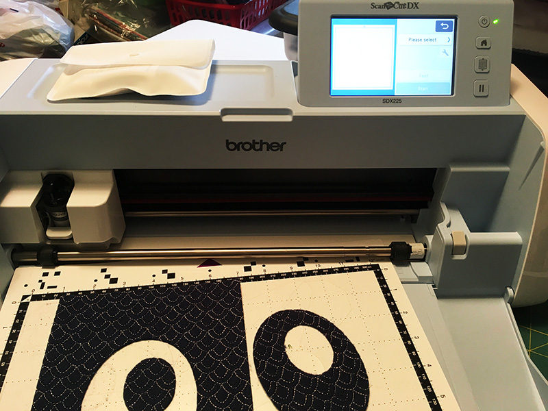 Note: I used PE Design 11 to create my appliqués. You can substitute many other methods, such as: • Cut out numbers with Scan N Cut and appliqué them with hand-guided machine stitches. • Use word-processing software to design letters and print them as outline-only characters to use as patterns. • Use BES lettering software to create the individual numerals. 1. Using the Appliqué Wizard in PE Design 11, select the font Ecuador, type "2", and set it to about 5" high (we'll refine that later). Make the finishing stitch a zigzag, 0.15" (3.8mm) wide. 2. Open the Size menu and uncheck the aspect ratio box. Set the size of your numeral to about 3 1/4" wide and 4 1/2" high; each numeral will vary a little bit due to its shape. Save your design as a .pes file. 3. Select just the first part of the embroidery design, the appliqué material, in the menu at the left edge of the workspace. For characters like the number 0 that have a discontinuous cutting line, group the sewing steps by color and select all of the appliqué material steps together. Export the cutting data to use with Scan N Cut. Save the .fcm file. 4. Repeat steps 1-3 to create the appliqué and cutting files for "0".Cut the pieces