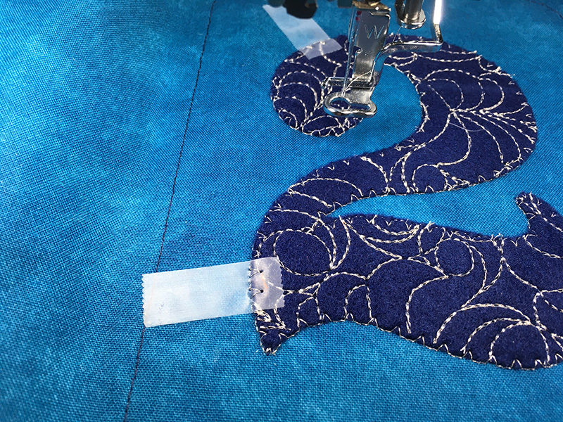 Tip: Rather than fusing the numeral to the background at this point, I use a bit of ordinary office tape to hold the shape in place. The tape tears away easily after the tack-down stitches.