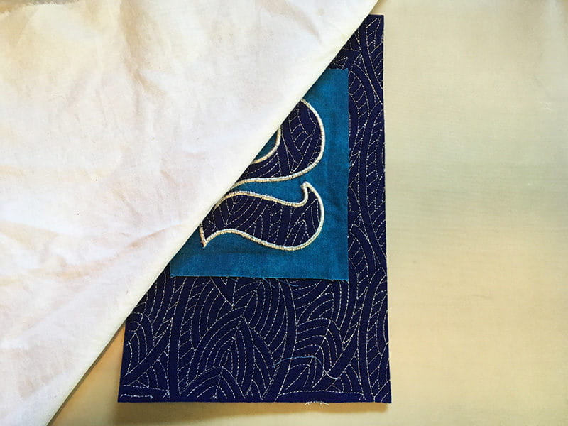 4. When the satin-stitched edging is complete, remove the fabrics from the hoop and tear away the excess stabilizer. Gently press the work from the wrong side and then apply a 5 1/2" x 6" rectangle of fusible web, centering it on the appliqué.