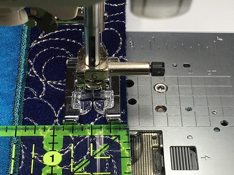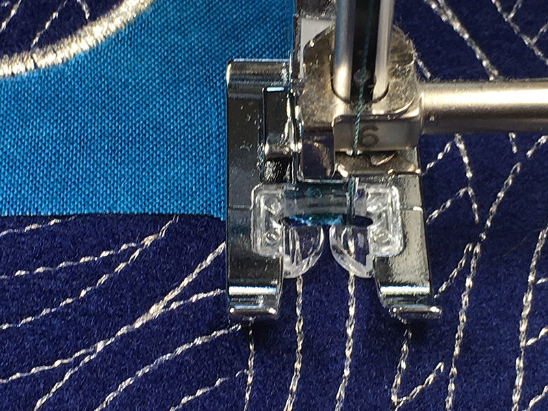 12. Thread the needle and bobbin with all-purpose navy-blue thread and switch to the J foot. Set the machine for a straight stitch 3.0mm long.