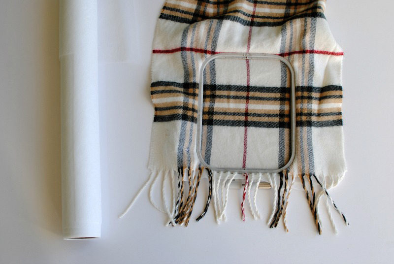 - For this scarf, it was easy with the plaid line down the center. I wanted the embroidery to be near the bottom edge. I like to mark with a fabric marking tool the center with the template.
