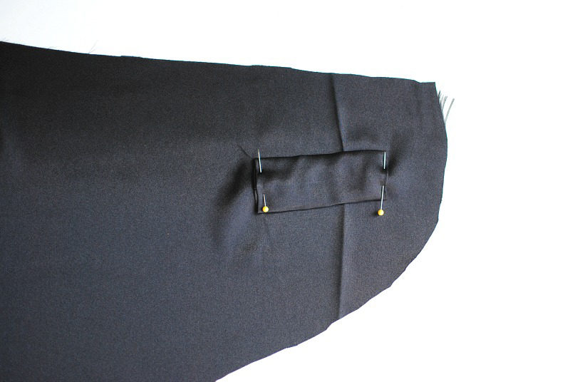 Draft a pattern that is similar to the template above or use a pattern. The overall measurements are personal preference based on how big or small you want the stole to be. I suggest using muslin fabric to get this right. Mine wrapped nicely around my shoulders and connects in the front with a tab sewn on the liner. I did add 1.5” (width) x 3” (length) darts about 8” from the center back edges. This helps keep the stole from falling off the shoulders.