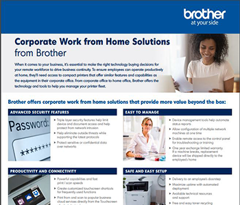 Brother is an expert at remote work – we offer printers, scanners, and multifunction products to help support your home office environment needs. We provide imaging devices that can help meet corporate security requirements and enable employees to continue digital transformation initiatives. For business leaders, this means helping to ensure business continuity even when employees are remote.