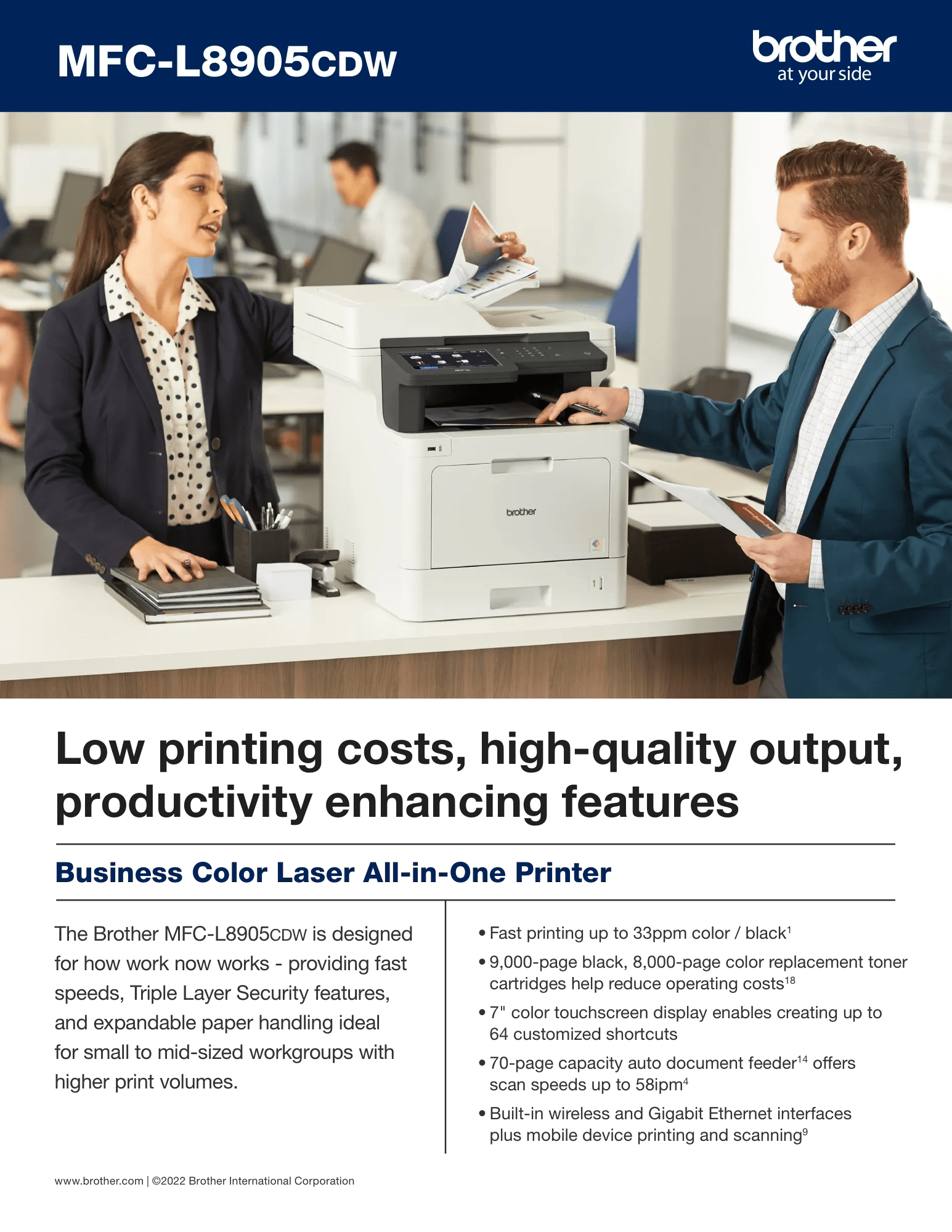 The Brother MFC-L8905CDW color laser all-in-one printer is an ideal choice for workgroups with high print volumes that need low-cost printing, advanced scanning, secure document handling, and reliable, business quality output. This high-performance color laser all-in-one helps to increase productivity with fast print and scan speeds. The large 7” touchscreen display provides easy menu navigation and allows you to create customized shortcuts to enable workflow productivity. Scalable paper handling helps to meet diverse printing needs. Offers flexible connectivity including built-in Ethernet and wireless networking and convenient mobile device printing and scanning‡ to help meet mobile workforce demands.