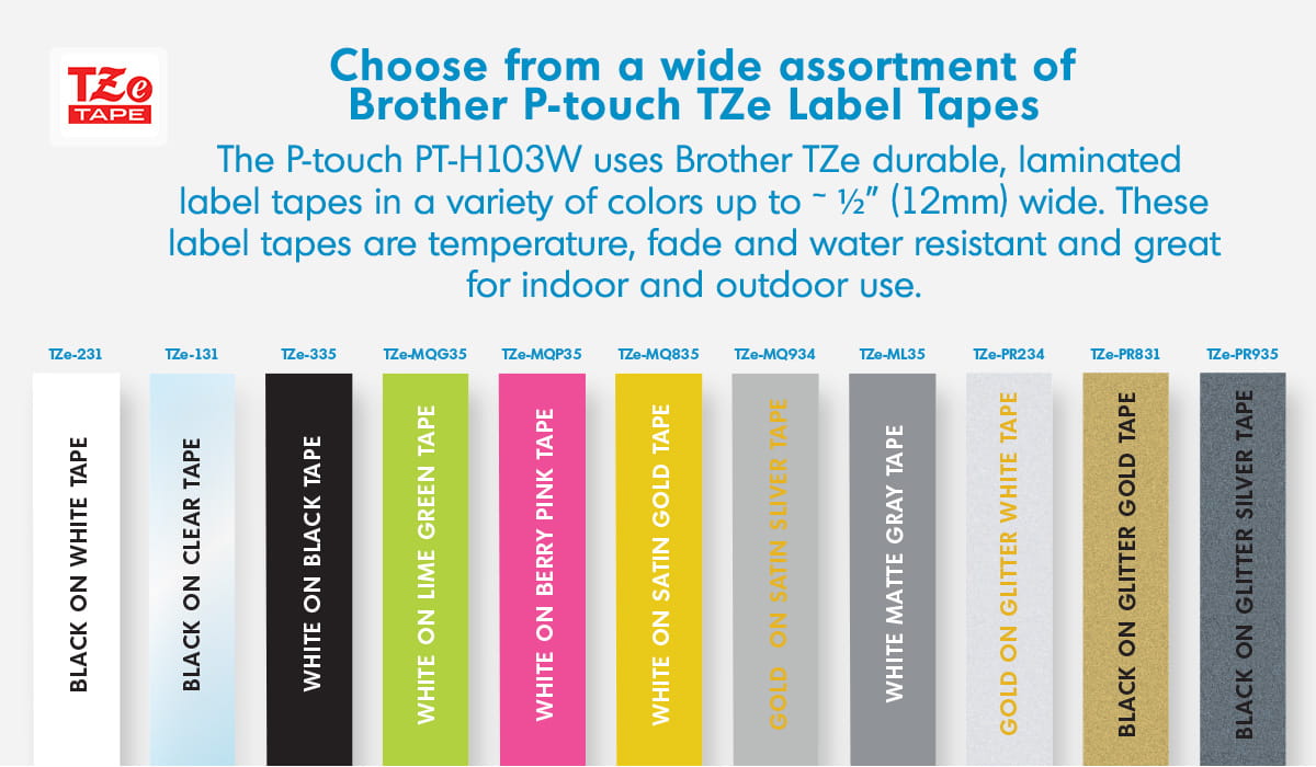 - When you are ready to organize, categorize, or personalize, the P-touch PT-H103W Handheld Personal Label Maker has a playful lineup of label tapes, fonts, frames, and symbols, so you can take life’s little clutters and make them more, colorful.