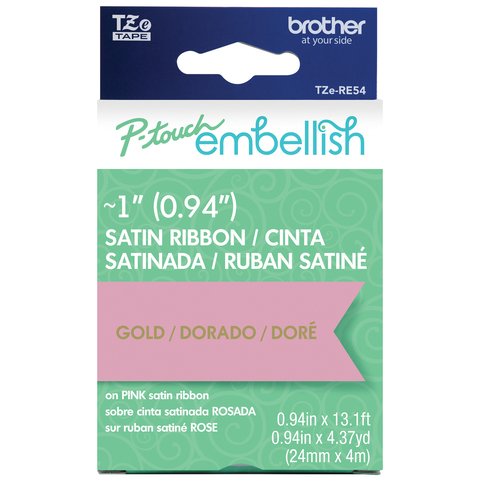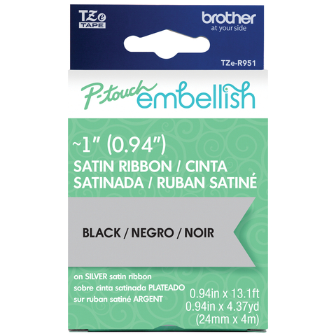 P-touch Embellish Black Print on Silver Satin Ribbon TZER951 - helps you create a delightful and lasting impression. Simply and beautifully add a personalized, decorative touch to gifts, wedding and party favors, scrapbooks and so much more. Use P-touch Embellish Black Print on Silver Satin Ribbon TZER951 to create one-of-a-kind customized ribbons using your P-touch Embellish ELITE Connectable Decorative Ribbon & Tape Printer (PT-P715eBT, sold separately). Choose from a variety of P-touch Embellish creative fonts, emojis, frames, symbols and patterns perfect for crafting, gifting and for celebrating special events and occasions like weddings, baby showers, holidays, birthdays and more. P-touch Embellish Black Print on Silver Satin Ribbon TZER951 - ~1" wide x 13.1’ long (24mm x 4m/4.37yds).