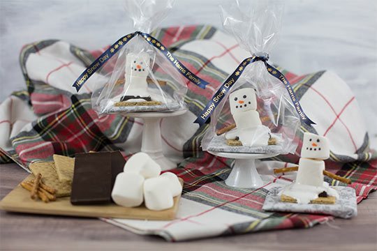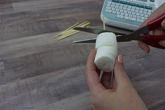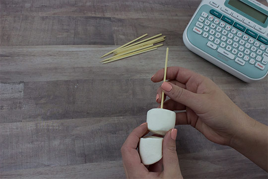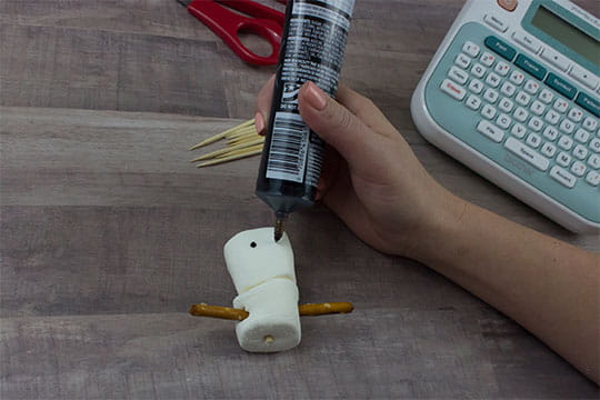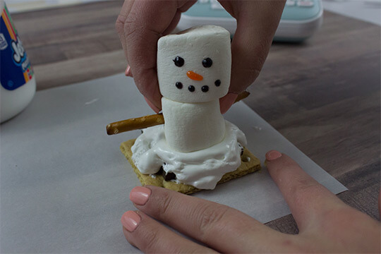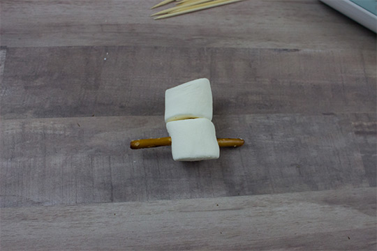Break pretzel sticks in half and stick in the side of the bottom marshmallow.