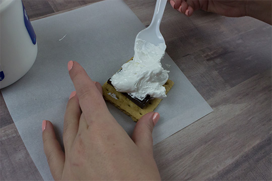 Place a spoonful of marshmallow fluff on a graham cracker with chocolate.