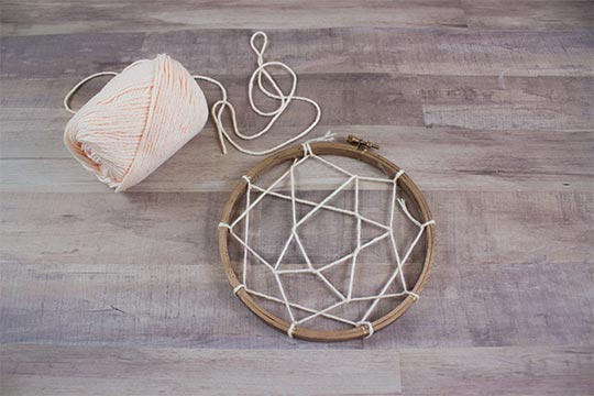 Once the outer edge of string has been attached, begin to form the middle weave. Loop the string through the first layer, in between the knots on the wooden ring, and continue this pattern all the way around. When the second circle has been completed, move to the third, and fourth, until the string has formed a small circle in the middle of the wooden ring.
