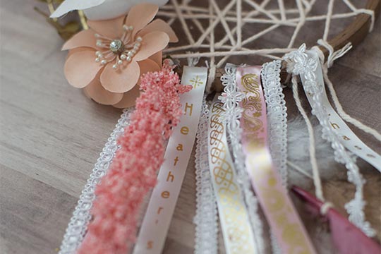 At this point, the dream catcher is almost complete. The last step is to decorate the outer edge of the wooden rim with flowers, and various colors and types of ribbon. Choose different sizes, colors, and types of flowers to create a border and secure with hot glue -- this also helps to cover the knots that were tied previously.