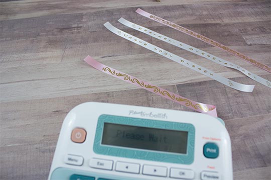 Use the P-touch Embellish to create a personalized message and patterns on different colored strands of ribbon. For the personalized ribbon, select the Adams font, type message and select, Frame 21 to create the star bursts. Be sure to also set the P-touch Embellishment text to “Vertical” so that it can be read while hanging. Print and cut the ribbon. Create a variety of 10.5-inch patterns in white and pink ribbon. Attach the ribbon at varying lengths to create a whimsical look.