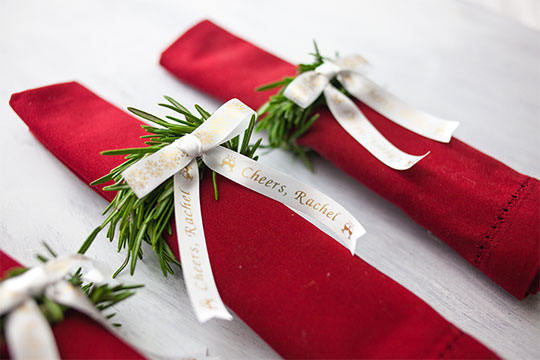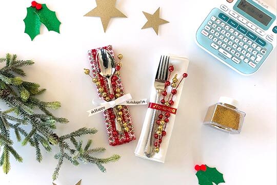First, decide whether you would like to add a bow or a simple message to your napkins. Using the Brother P-touch Embellish, select the ribbon template you would like to use and add the text for your message, for example, “Cheers, Mary”, ‘Happy Holidays’ or ‘Fa-la-la.’ Add symbols for extra fun!