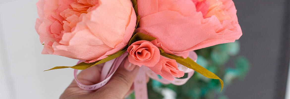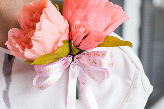 This Mother of the Bride corsage is made of fine crepe paper to give the peonies a life-like look and a personalization with the Brother P-touch Embellish. Follow the instructions below on how to make a gorgeous paper flower peonies corsage.