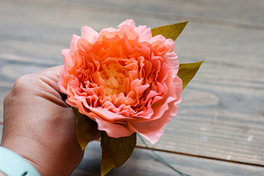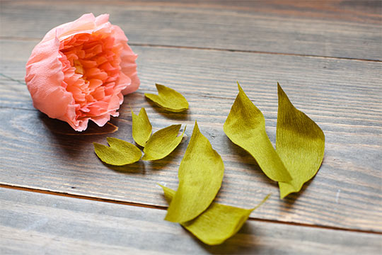 Hot glue the small and large leaves at the bottom on the peonies.