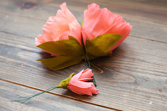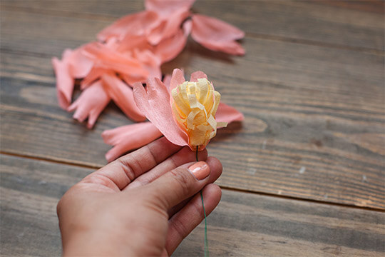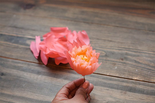 Repeat steps 2-10 for the second peonies. Use a mix of pink crepe papers. When done, wrap the peonies stems together using the floral tape.