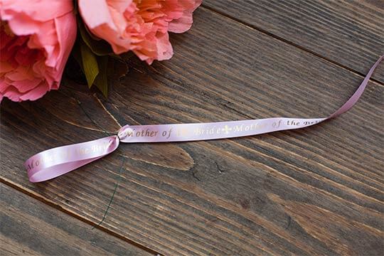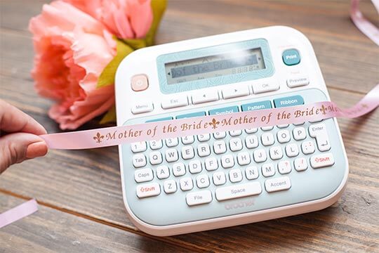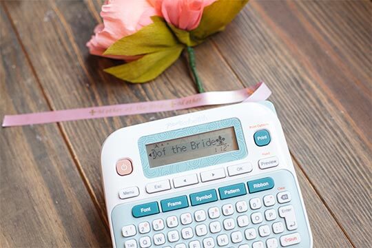 Clear the setting on the P-touch Embellish. Type in “Mother of the Bride”. Select Font, then Style and select Vertical. Print the ribbon. Then clear the message and print another ribbon with the name of the Mother of the Bride.