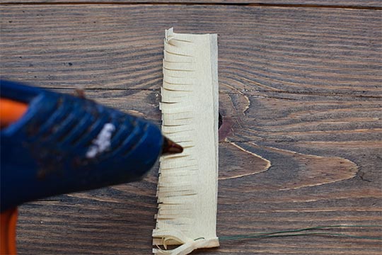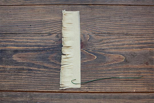 Start with the yellow crepe paper. Stack the two sheets of crepe paper and cut the strip ¾ in horizontally. Create frays from top to bottom.