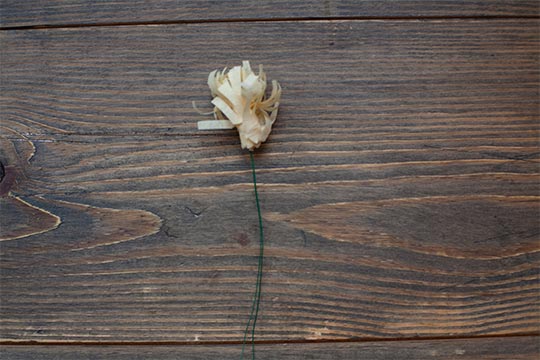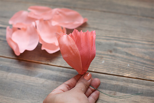 Make two small buds using the remaining small petals. Stretch and wrap the petals around the wire. Continue to layer the bud until all of the petals are used up. Use the remaining large leaf to wrap it around the buds.