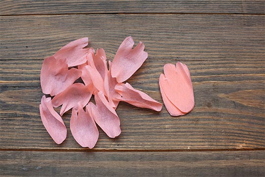 Take the small to medium petal and use your thumb to spread the interior of the petal outward. Stretch the crepe paper to create a curved petal. Stretch the curvy tip of the petal to spread the crepe paper. This creates a realistic looking peonies petal. Do this for the 12 petals.