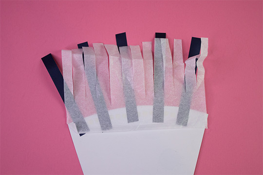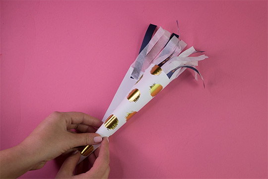 Cut a piece of tissue paper to fit the length of the rounded edge of your long triangle. Leave 1.5-3 inches hanging off the edge of the rounded edge. Tape the tissue paper to the inside of the triangle to secure. Using your scissors, cut strips up towards the rounded edge to create more dimension for your party horn. Using your P-touch Embellish, create strips of ribbon with different patterns to add to this bottom edge. For this project, we used navy ribbon with gold text and pattern # 21. Tape these pieces of ribbon to the inside of the triangle, underneath the tissue paper.