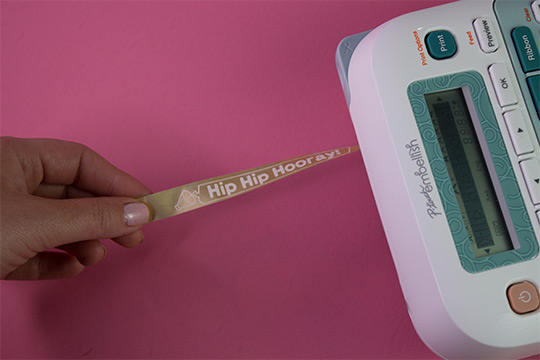 Now, use the P-touch Embellish with tape to print out the message for your party horn. For this project, we used the mint chevron tape with black text to write “Hip Hip Hooray!” Set this aside for later. You will put this piece of tape on the party horn at the end.