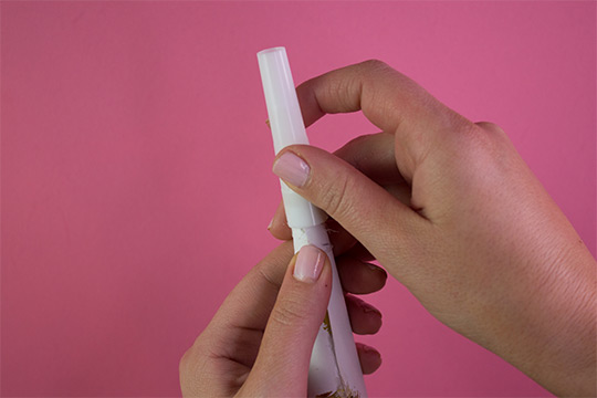 Next, remove the mouthpiece and put a little glue at the top of the party horn. Slide the mouthpiece back on to the horn to secure in place. Finally, place your embellished tape to the outside of the horn, and you are finished!