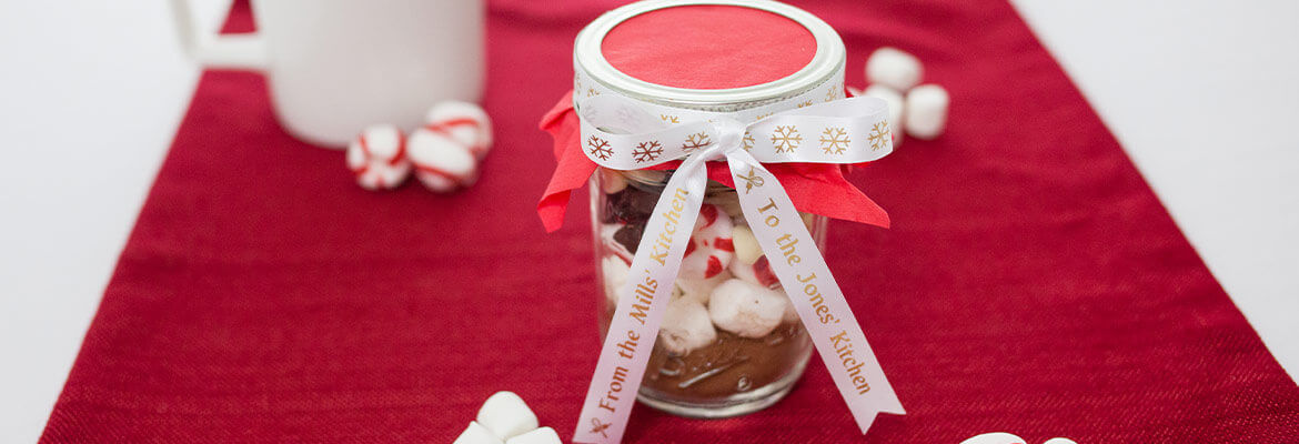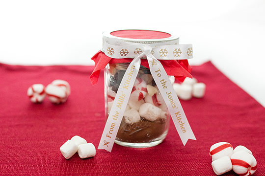 Layer the ingredients in the jar starting with the cocoa mix, followed by the marshmallows, peppermint candy and chocolate candy. Place a piece of tissue paper between the two pieces of the lid for a decorative touch. Seal tightly. Lastly, use the P-touch Embellish to create a personalized ribbon to wrap up the project. To make the cocoa, just combine the ingredients of the jar with hot water!