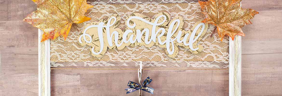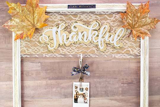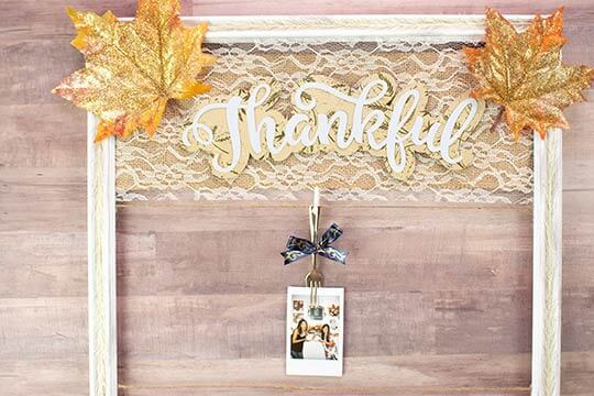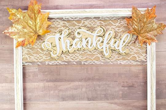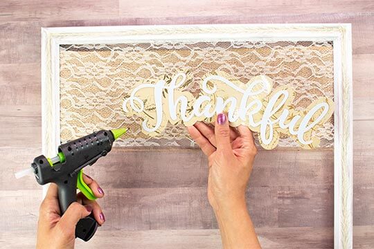 Flip the frame over and glue the “thankful” cut out on the burlap/lace.