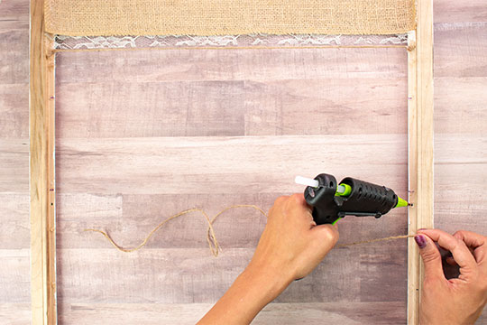 Flip frame over and attach the burlap and lace to the back of the frame using the hot glue gun.