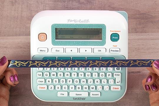 Next, use the P-touch Embellish to print a pattern ribbon. Select your favorite pattern and print a 12-inch piece. Print one for each photo you want to hang.
