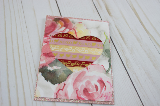 Cut the second piece of decorative paper slightly smaller than the card. Place the heart template on the piece of the decorative paper from step 3 and use the detail knife to cut a heart out of the center of the paper.