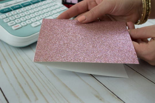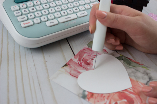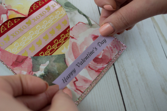 Top with the heart paper using adhesive dots. Next, load the P-touch Embellish with pastel purple tape, type and print a personalized message. Remove the backing from the tape and adhere to the card. Next, load the P-touch Embellish with pastel pink tape and create a personalized message for inside the card.