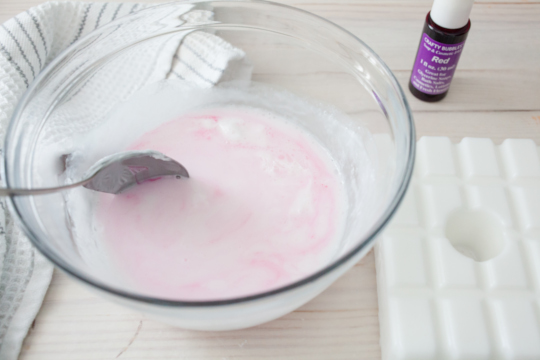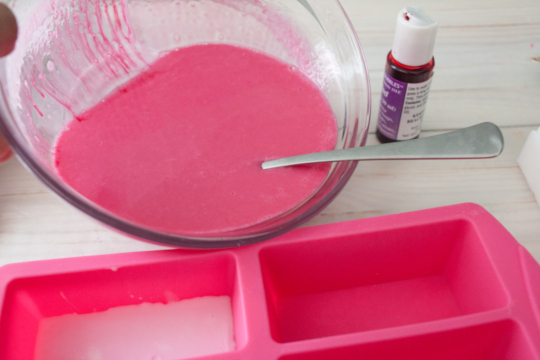 Add 4-6 drops of red dye and essential oil into the white glycerin soap to make a light pink shade and to add scent. Mix well.
