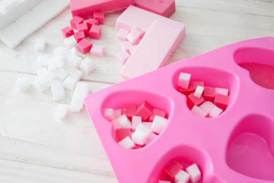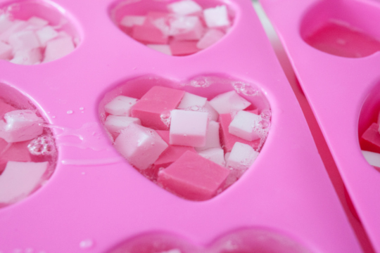 When the pink and red soap hardens, remove the soap from the tray and cut the soap into small cubes. Cut a few of the remaining white glycerin soaps to have a variety of pink, red and white soap cubes. Fill the heart trays with the soap cubes.