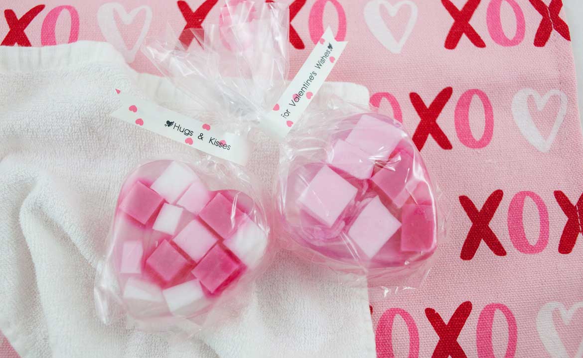 When the soap is cooled and hard, pop it out of the heart tray. Drop them in a treat bag wrapped in a personalized message for your Valentine.