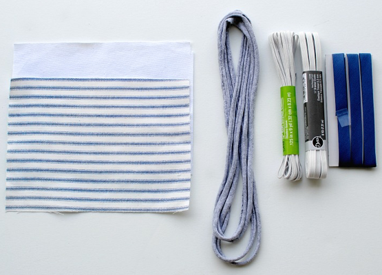 ● Fabric: 2 by 6″ x 9″ ● Elastic: 2 x 7″ strips ● Fabric Straps: 4 x 20″